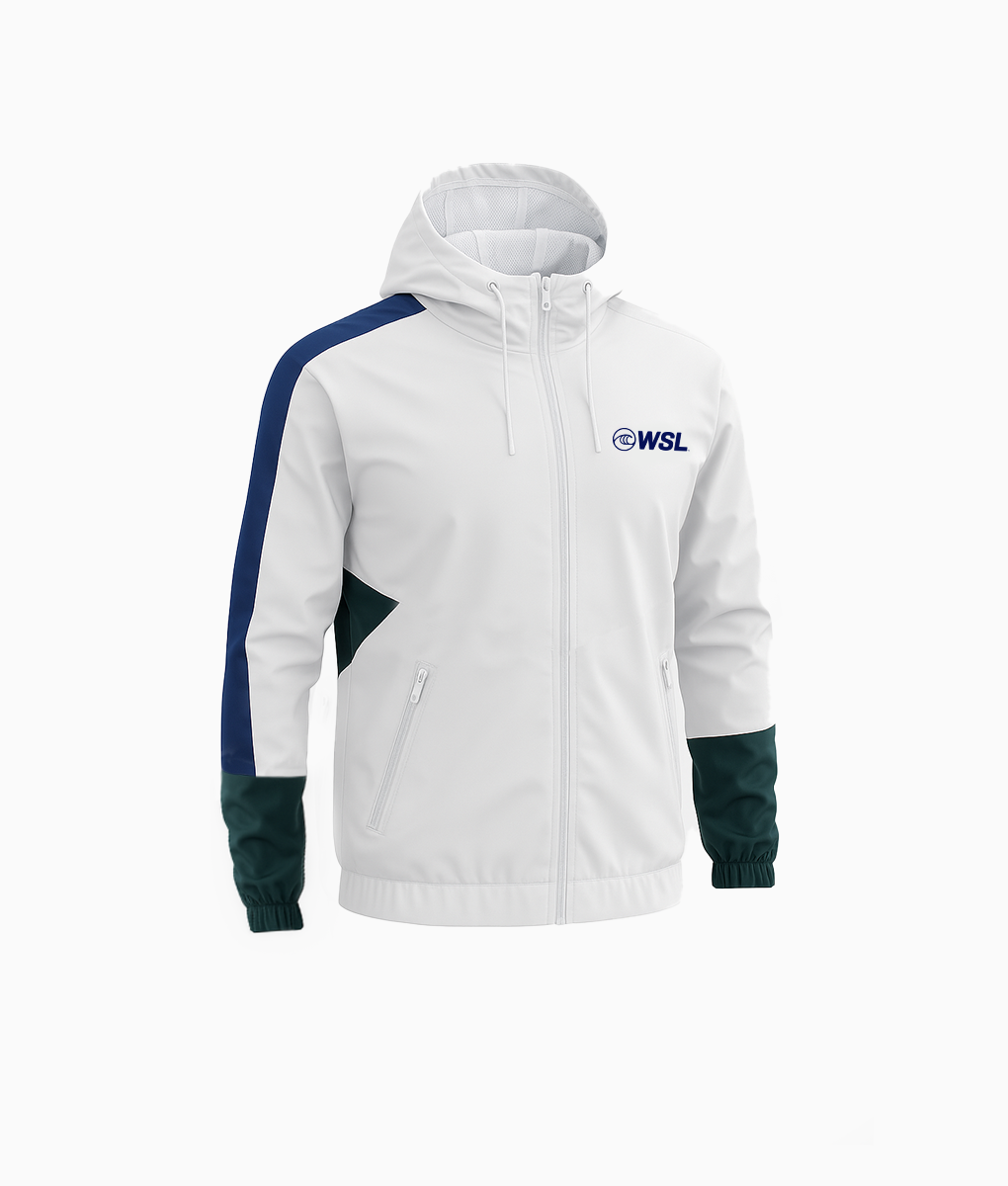 Corta-vento WSL branco com capuz, detalhes em azul-marinho e verde escuro nas mangas e laterais. Leve, com bolsos frontais e zíper, ideal para curtir o vento com estilo surf.