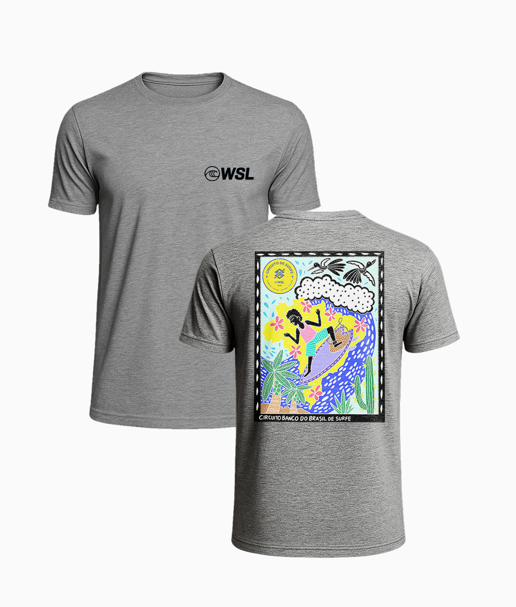 Camiseta estampada com o pôster oficial do Circuito Banco do Brasil de Surfe 2025.