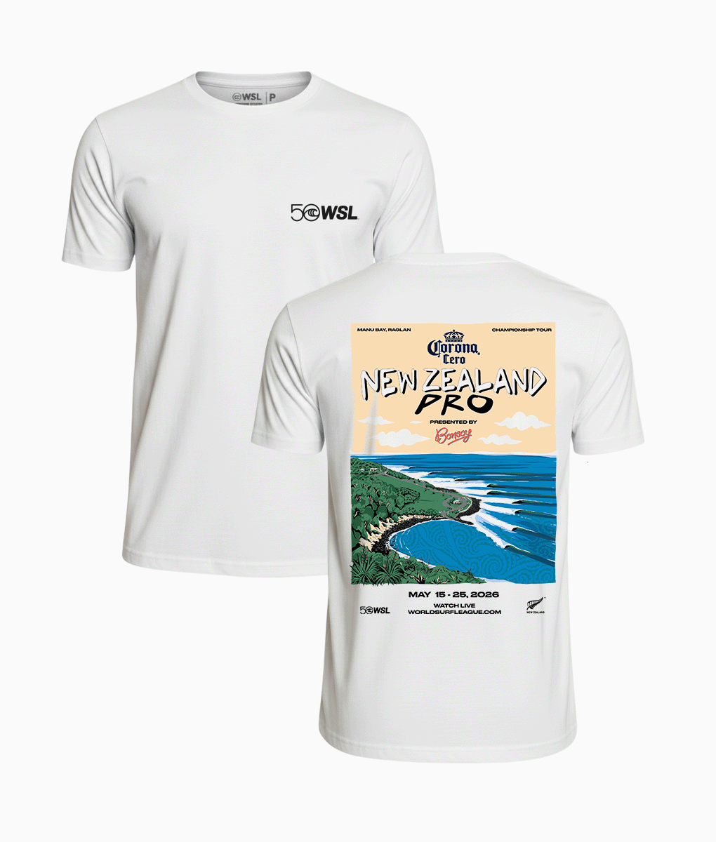 Camiseta WSL Poster – New Zealand Pro. com arte inspirada nos posters clássicos do Championship Tour, esta camiseta apresenta nas costas o poster oficial do evento, destacando a paisagem e as ondas marcantes de Raglan.