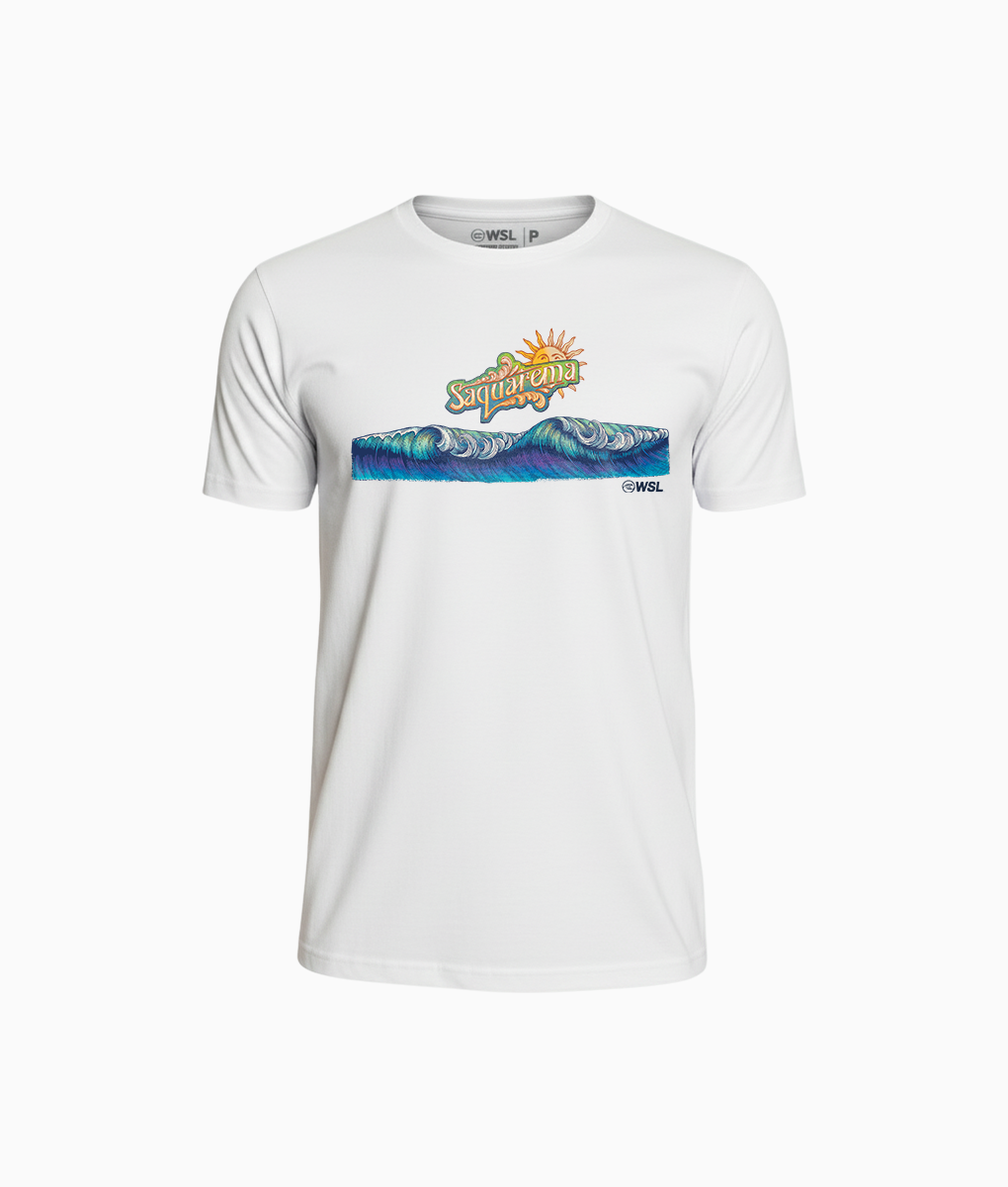 Camiseta WSL Saquarema branca com estampa de ondas e sol, inspirada no poster oficial da etapa Vivo Rio Pro 2025. Conforto, estilo surf e vibe brasileira em uma peça oficial e exclusiva.