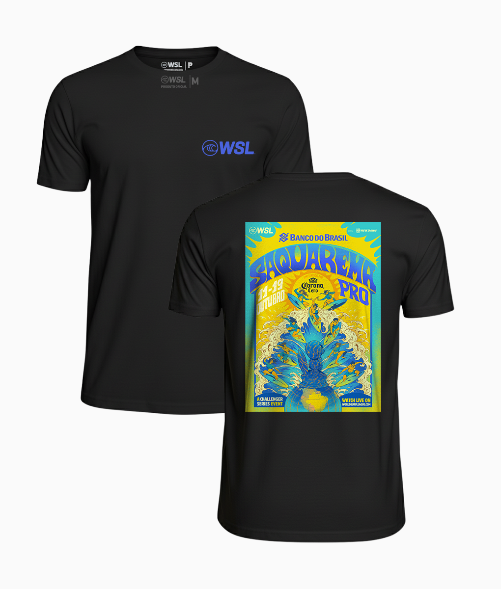 Camiseta estampada com o pôster oficial do Saquarema Pro By Corona 2025. Relembre os momentos incríveis e emocionantes de mais uma etapa do World Surf League.